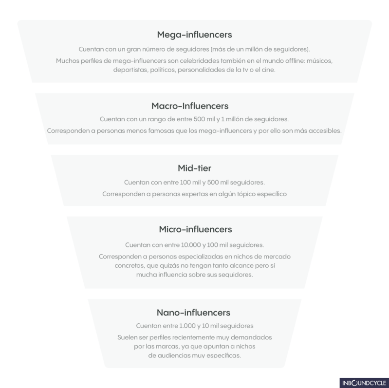 Un influencer o, llamado también, "creador de contenido" es una persona que destaca en el ámbito de las redes sociales como Instagram, TikTok, YouTube, Twitch, etc. ¿Cómo ha llegado hasta donde está? Comparte su estilo de vida publicando contenido online inflyendo en las decisiones de otras personas con ciertos conocimientos y consiguiendo, así, una gran cantidad de seguidores/suscriptores. Dependiendo del número de seguidores, se consideran de una forma u otra: